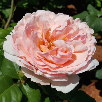 - hellrosa, pfirsich überhaucht, intensiv duftend, Blütenblätter gerüscht